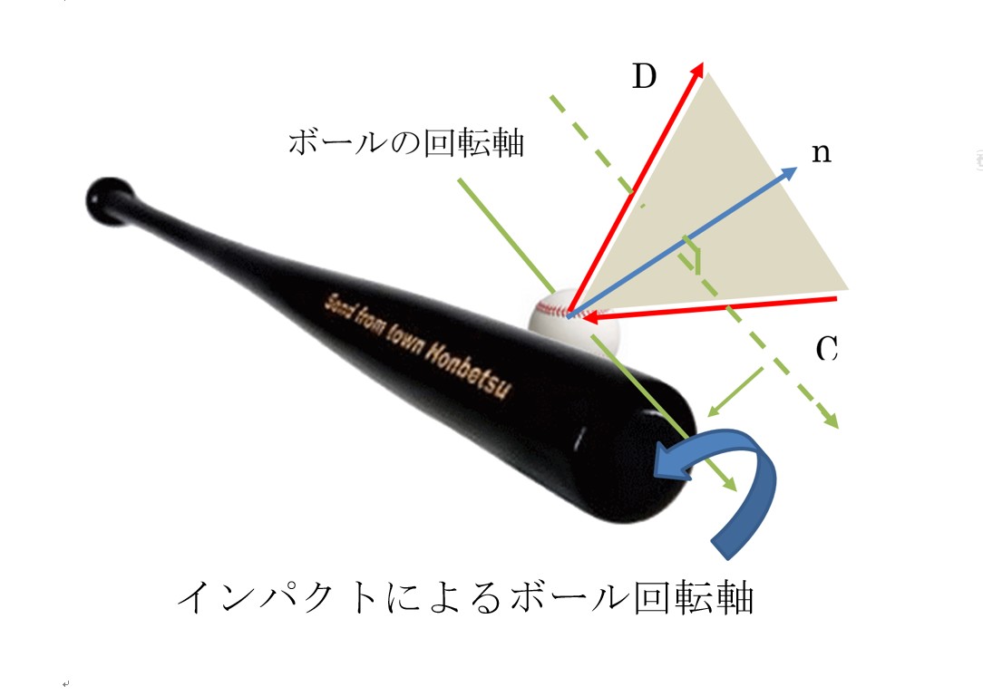 バットによる投球のインパクトに伴う、インパクト後の打球速度ベクトルの算出手順を概説します。本解析では、ピッチャーマウンドを原点とするグローバル座標とバッターの立ち位置を原点とするローカル座標があって複雑ですが、簡単に言えば、バットに対する相対速度ベクトルとしての投球速度ベクトルに関して、インパクト位置のバット面の法線方向に直角な成分に反発係数を掛けた場合の鏡像ベクトルを、最終的にグローバル座標に戻します。実際には、投球の回転による影響も入れています。バッティングにより生じるボール回転軸は、図に示すように、インパクト前後のボールの速度ベクトルを含む面に直角な方向としました。さらに、投球自体のボール回転がある場合は、回転数の重みを付けた回転軸のベクトル合成により打球の回転軸ベクトルを決定しました。