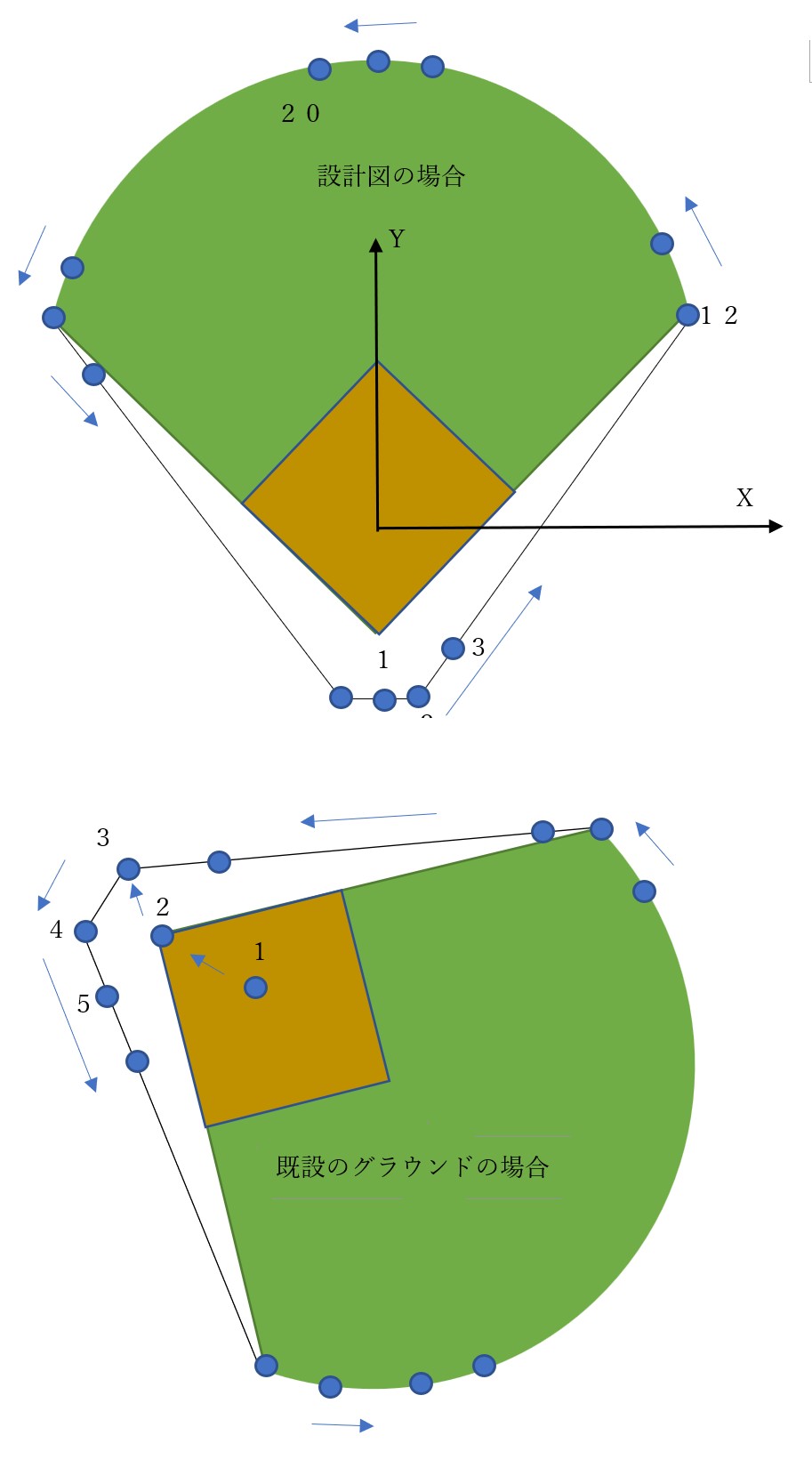 新規のグラウンド設計の場合は、設計図を用います。ピッチャーマウンドを原点として、1塁方向をX、センター方向をYとしたポールの位置(m)および防球ネットの高さ(m)を決めてください。
