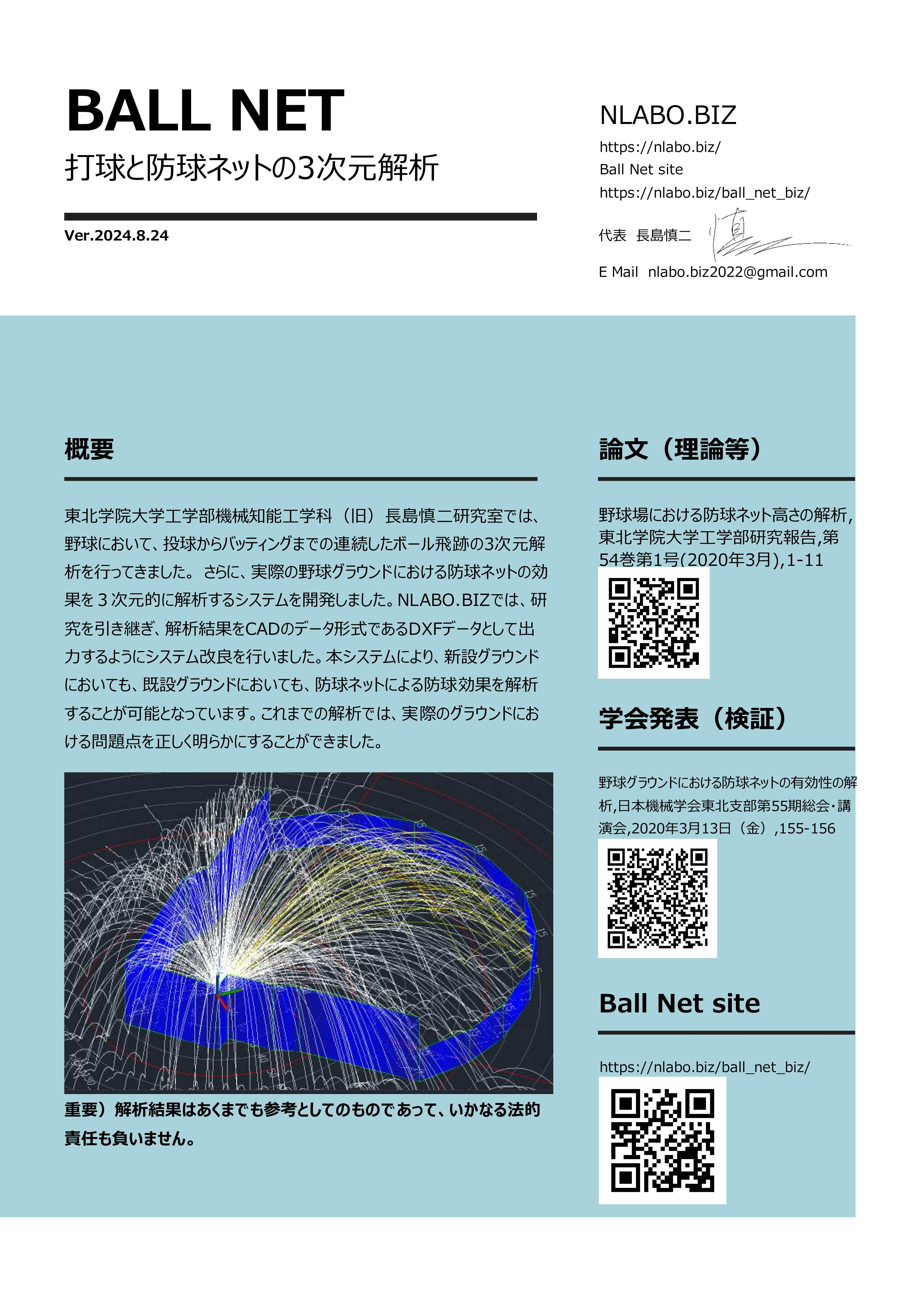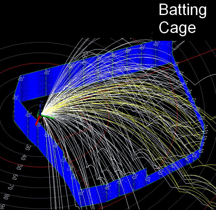 東北学院大学工学部機械知能工学科(旧)長島研究室では、野球において、投球からバッティングまでの連続したボール飛跡を3次元解析してきました。解析は、任意の防球ネット高さを設定した場合の防球効果に加えて、防球ネット高さの自動計算や、バッティングケージを用いた場合や、天井ネットを設置した場合などの防球効果を計算可能です。既設の野球グラウンドにおける解析も、新設のグラウンドにおける解析も可能ですので、ご相談ください。