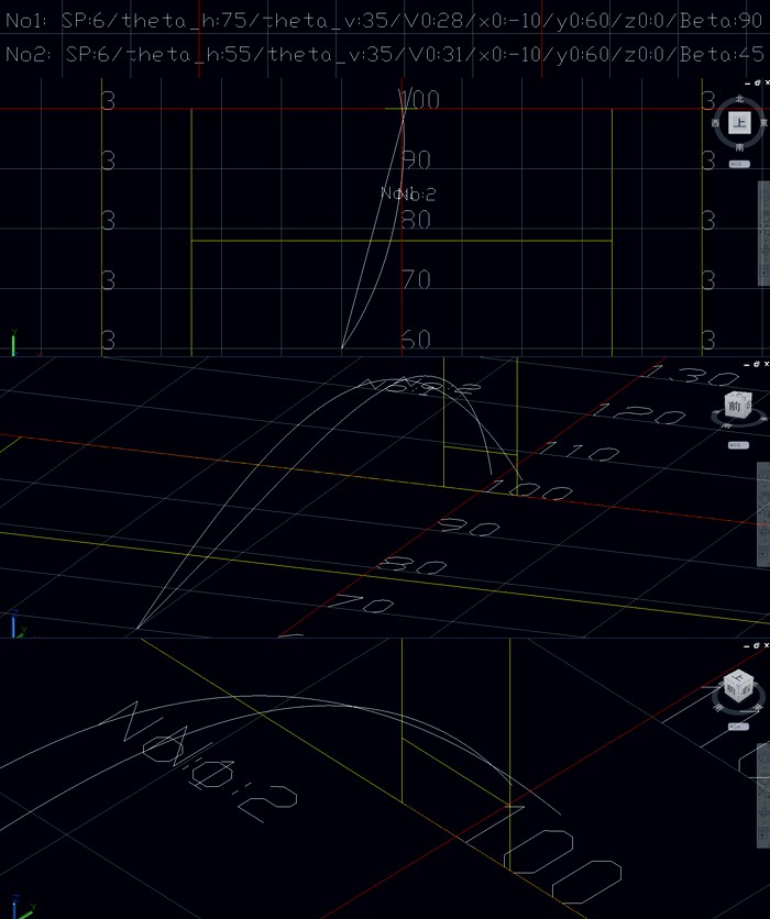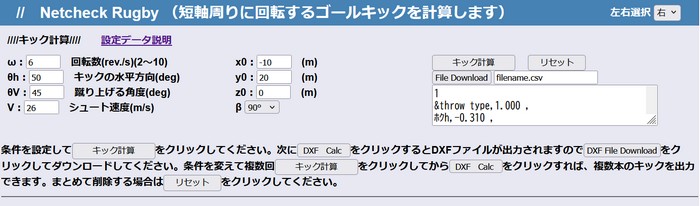 ラグビーでキックしたボールの飛翔のシミュレーションを行います。過去に行われたラグビーボールの空力特性に関する実験データを基にして、任意の位置から任意に設定した方向、蹴り上げる角度、またボールの回転数などによるボールの飛翔軌跡を計算し、3D CADで見ることができます。