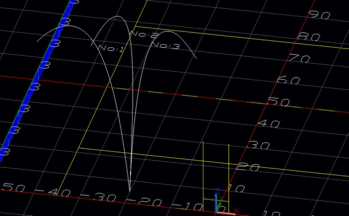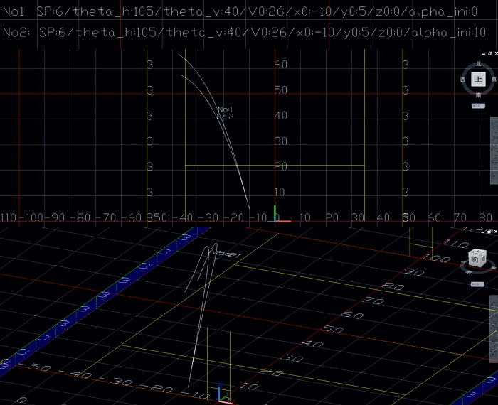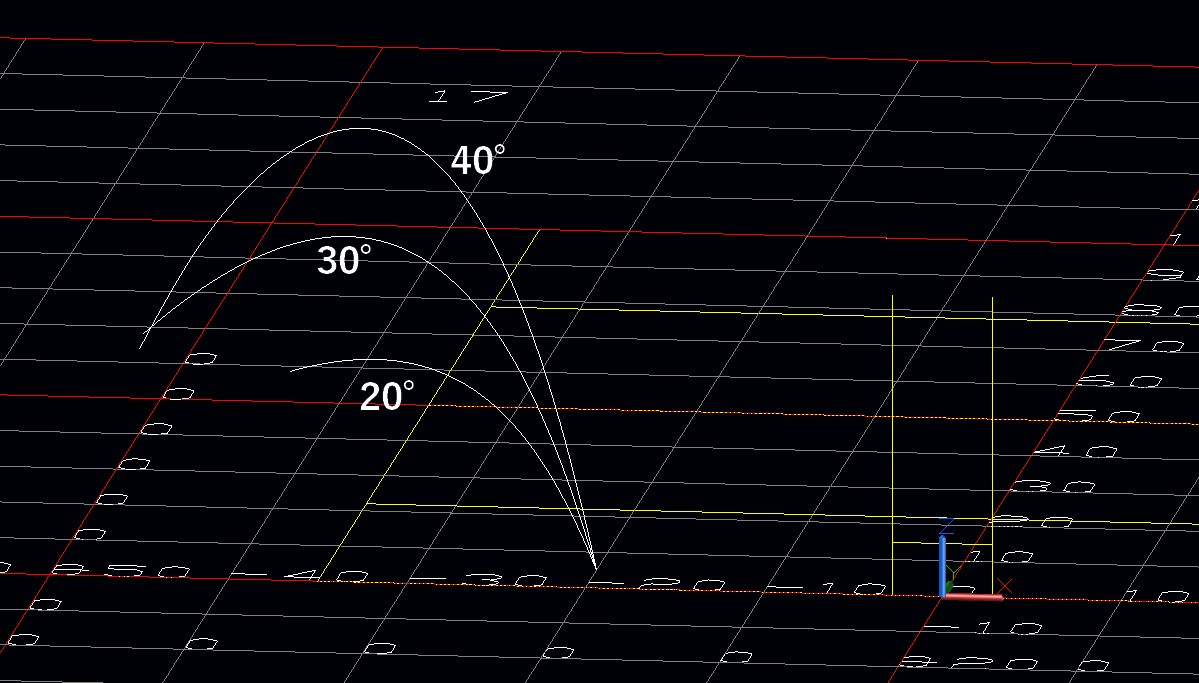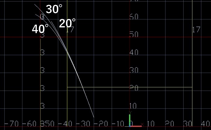 次の2つの図はαの初期値を0°、蹴り上げ角度を20°,30°,40°にしたものです。蹴り上げ角度が大きいほど、落下時のαがおおきくなり、飛跡は水平方向に逸れていきます。この結果では蹴り上げ角度が30°が比較的曲がらず、飛距離も出ています。実際のゲームでは参考になるかと思います。