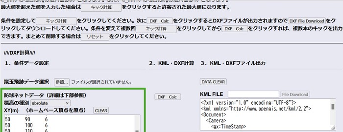 Webアプリケーションで、防球ネットを設定することができます。データはポールの(X,Y,H)です。