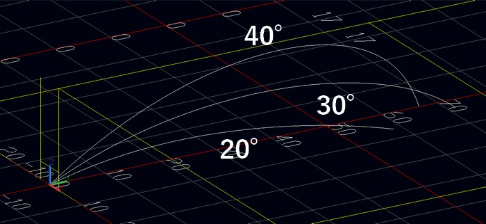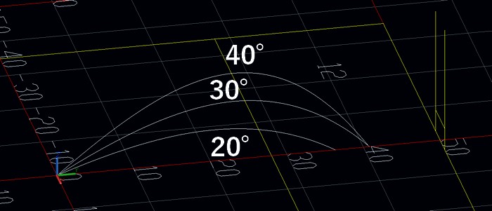 いずれも初速度は26(m/s)で、蹴り上げ角度を20°、30°、40°としました。