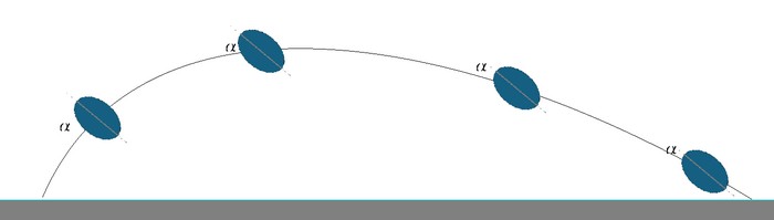 ただし、シミュレーションでは、αは、蹴りだし時の初期値は設定しますが、ボールの回転に伴うジャイロ効果に基づいて回転軸の傾きは一定と仮定しますのでボールの飛翔に伴って変化することになります。(下図)(ボールが水平方向に曲がっていく場合はその分もαの補正を行うべきことが想定されますが、そもそも、水平面内において、回転軸の方向がボールの進行方向とずれる場合の空力特性は明らかになっていませんので、補正はしていません。あるいは、水平面内において、回転軸の方向がボールの進行方向に一致するという条件でシミュレーションを行っていることになります。)